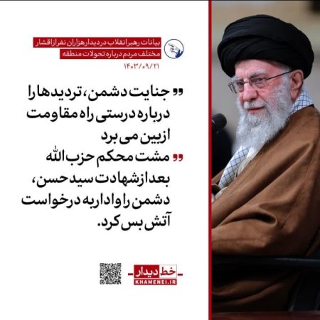 رهبر معظم انقلاب در دیدار صبح امروز با هزاران تن از اقشار مردم در مورد تحولات اخیر منطقه، خصوصا سقوط دولت سوریه و حملات رژیم اشغالگر قدس به ایراد سخنرانی پرداختند.