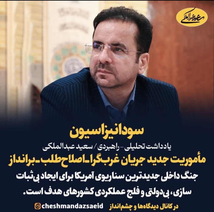 ⁉️ 💥 سودانیزاسیون 📌مأموریت جدید جریان غربگرا ـ اصلاحطلب ـ برانداز 🗒️ یادداشت تحلیلی / سعید عبدالملکی ✍️ جنگ داخلی جدیدترین سناریوی آمریکا برای ایجاد اغتشاش، براندازی و بیدولتی در کشورهای هدف …